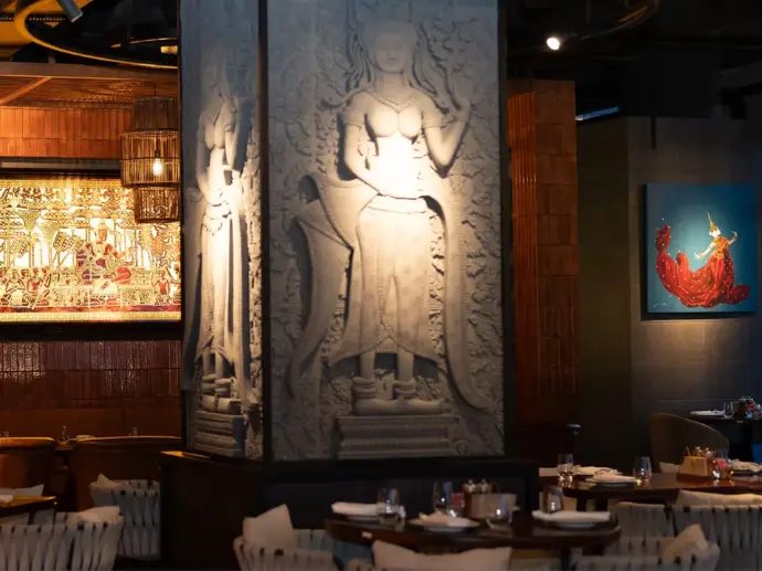 Les clients sont invités à savourer des plats élaborés avec expertise dans une atmosphère élégante mais décontractée, accompagnés de cocktails signature et d'une vue imprenable sur le fleuve. Le cadre chic et accueillant inspiré du Cambodge est rehaussé par un éclairage doux et des éléments culturels subtils, créant une expérience culinaire unique qui passe harmonieusement du jour à la nuit.